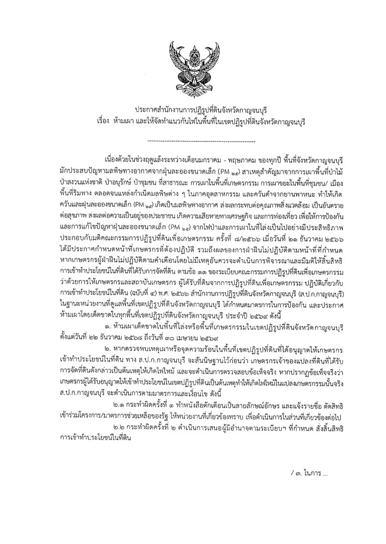 กรมควบคุมมลพิษ กำชับให้แต่ละพื้นที่คุมเข้มการบังคับใช้กฎหมายห้ามเผา เพื่อรับมือสถานการณ์ไฟป่า หมอกควัน และฝุ่นละออง PM 2.5 มีโทษปรับสูงสุด 2,000,000 บาท จำคุก 20 ปี หรือทั้งจำทั้งปรับ
